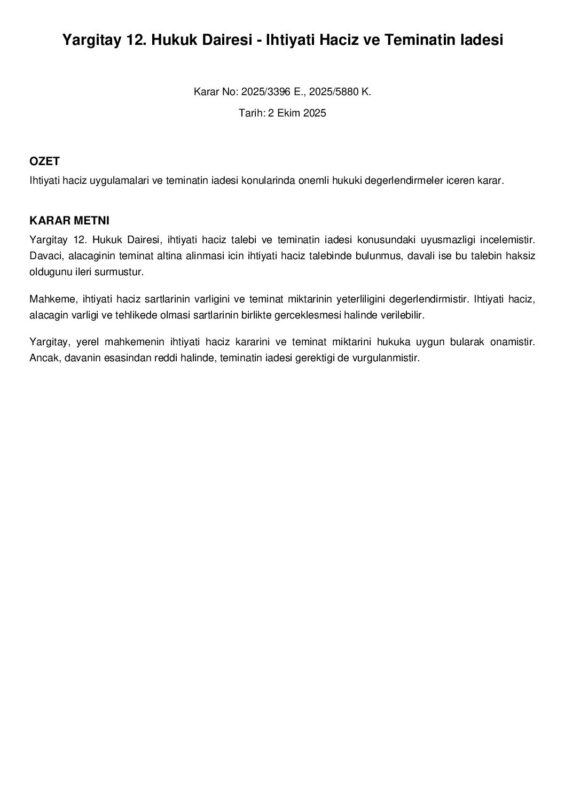 ÖZETYargitay 12. Hukuk Dairesi, ihtiyati haciz talebi ve teminatin iadesi konusundaki uyusmazligi incelemistir.Davaci, alacaginin ...