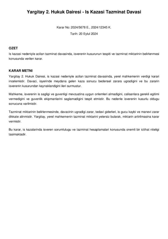 KARAR METNİYargitay 2. Hukuk Dairesi, iş kazası nedeniyle acilan tazminat davasinda, yerel mahkemenin verdigi karariincelemistir. D...
