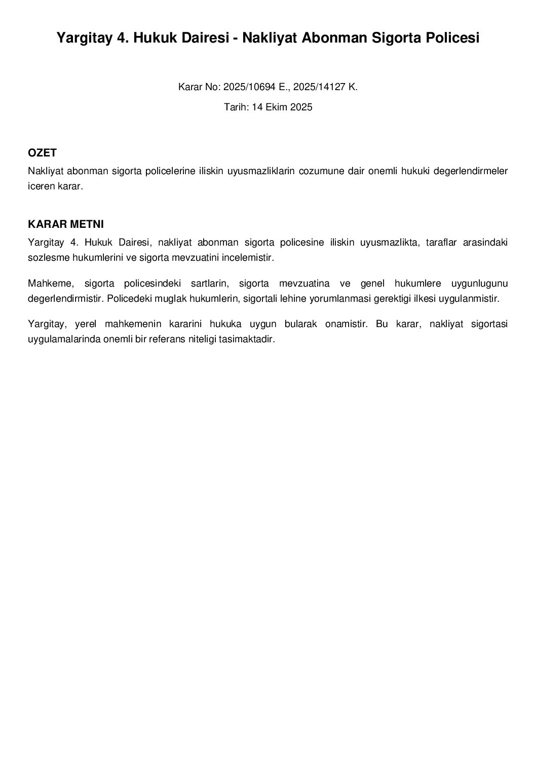 Yargitay 4. Hukuk Dairesi, nakliyat abonman sigorta policesine iliskin uyusmazlikta, taraflar arasindaki